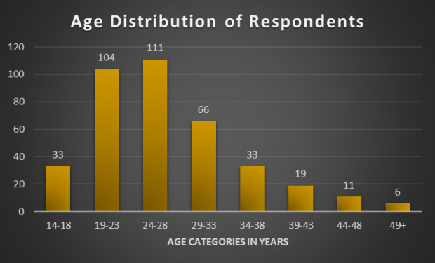 Figure 7 is a condensed distribution of the age item, since illustrating every single age category would have caused unnecessary visual clutter. The most commonly reported age was 27, which was also the average for the distribution as a whole. Ages reported ranged from 14 years old to 65 years old.