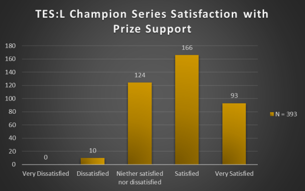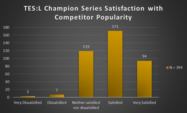 The last two items regarding the TES:L Champion Series asked participants to indicate how satisfied or dissatisfied they were with the rate at which the tournaments increased prize support and featured popular players, including guests who don’t regularly play TES:L. These two items are illustrated in Figures 4 and 5, respectively.
