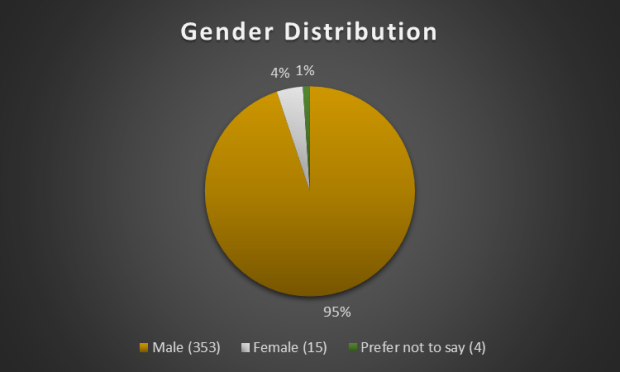 The final two items worth mentioning on the survey were demographic in nature. Since I neglected to gather demographic information in my first Community Survey, I made sure to collect age and gender information here. Figure 6 highlights the gender breakdown among the respondents to the tournament survey. Participants were able to report their gender as male, female, other with the option to specify, or indicate that they prefer not to say.