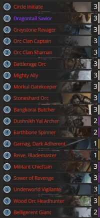 Orc Warrior is an aggressive Midrange deck that takes advantage of Orc synergy to get ahead on board with big plays on curve like Bangkorai Butcher and Wood Orc Headhunter or big tempo gains with the help of Stoneshard Orc.