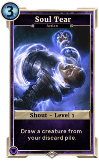 The Banish text seems like a no-brainer to me. A card like Memory Wraith would need to be played at the exact right time to remove the correct target, and the Soul Tear player can just wait for a different powerful target to loop a lot of the time. However, now that banishment exists in this game thanks to the Wraith, it seems reasonable that it would be applied to Soul Tear as well. This means that even if the Soul Tear player has leveled up the Shout to 3 by the time the first one is played to loop the unique Paarthurnax or Tazkad, there is an additional safety measure in place to prevent such a thing. It also prevents cycling the same copy of Giant Bat multiple times in the same turn for massive life gain if that were the only copy played until that point of the game. To me, it also fits the “lore” of the card; the action is called Soul Tear – is that really something that can happen to the same creature more than once?